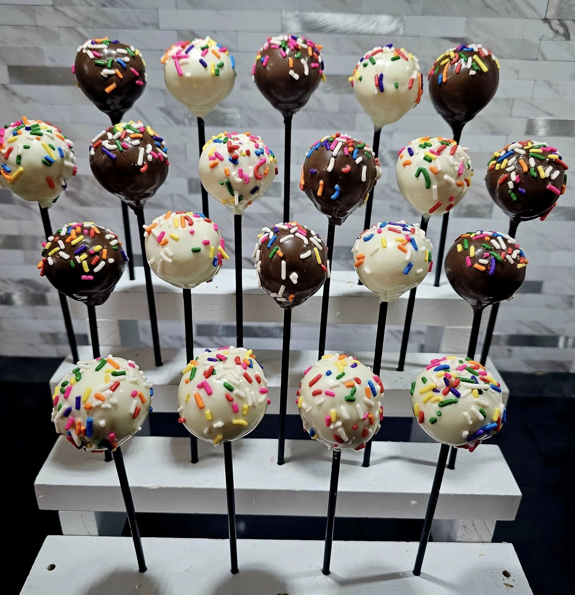 Cake pops are the name of the game at the Cafe. Today we had some basic vanilla cake flavored pops coated in a mixture of white and milk chocolate, then covered in some sweet colorful sprinkles.